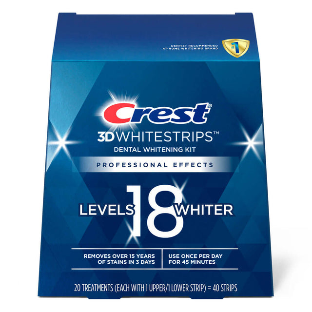 REMOVE OVER 15 YEARS OF STAIN IN 3 DAYSNeed whiter teeth, fast? Crest 3D Whitestrips Professional Effects is designed to whiten like a professional-level teeth whitening treatment at-home. This enamel-safe treatment will remove over 15 years of stains in 3 days, with full results in 20 days.Recommend to patients 18+ who want fast whitening at home, don’t experience sensitivity, and only want to think about whitening once a day.RETURNS ARE NOT ACCEPTEDReturns for all Crest 3D Whitestrips are not accepted due to temperature control requirements.ADVANCEDSEAL™ NO SLIP TECHNOLOGYCrest 3D Whitestrips are flexible, thin strips coated in a tooth whitener containing hydrogen peroxide designed to securely conform to the shape of your teeth and keep the tooth whitener in place.Crest AdvancedSEAL™ No Slip Technology provides a form fit, no-slip grip that molds and adheres to teeth for a better whitening experience. Strips stay put until you take them off, allowing you to talk and even drink water while whitening your teeth.INSTRUCTIONS TO USEUSE STRIPS ONCE A DAY FOR 45 MINUTES. For full results use entire kit. Use up to two kits per year.1. PEEL: Peel the upper and lower strip from plastic backing liner. and apply strips to upper and lower teeth. WEAR FOR 45 MINUTES.2. APPLY: Using a mirror, apply gel side of strip to front teeth. Align straight edge of strip with gumline. Fold over teeth and press to secure. WEAR FOR 45 MINUTES.3. SMILE AND GO: Peel strips from back of teeth first to ease removal.It is best if you do not brush your teeth immediately before applying strips.