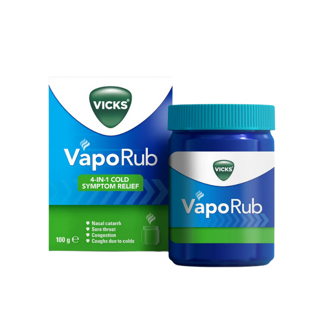 P&G Vicks Vaporub Jar, 100 g 24/cs. Vicks Vaporub is a medicinal ointment that relieves the symptoms of cold in adults and children above two years old. Thanks to its active ingredients, including menthol and eucalyptus oil, Vicks VapoRub helps to relieve nasal catarrh (inflammation of mucous membranes in the nose and throat), nasal congestion, sore throat, and coughs due to colds. Don’t let cough and cold come in the way of you and your family’s sweet dreams. Vicks VapoRub gives you 8 hours of relief from cough and cold so you can enjoy a full night of restful sleep, even with a cold. Vicks VapoRub Chest Rub and Vapourising Ointment relieves 4 cough & cold symptoms; cough, blocked nose, muscular aches & pains. Provides up to 8 hours relief from cold symptoms (From Nasal Congestion due to colds) Blocked nose relief in 5 minutes Suitable for adults and children above 2 years old