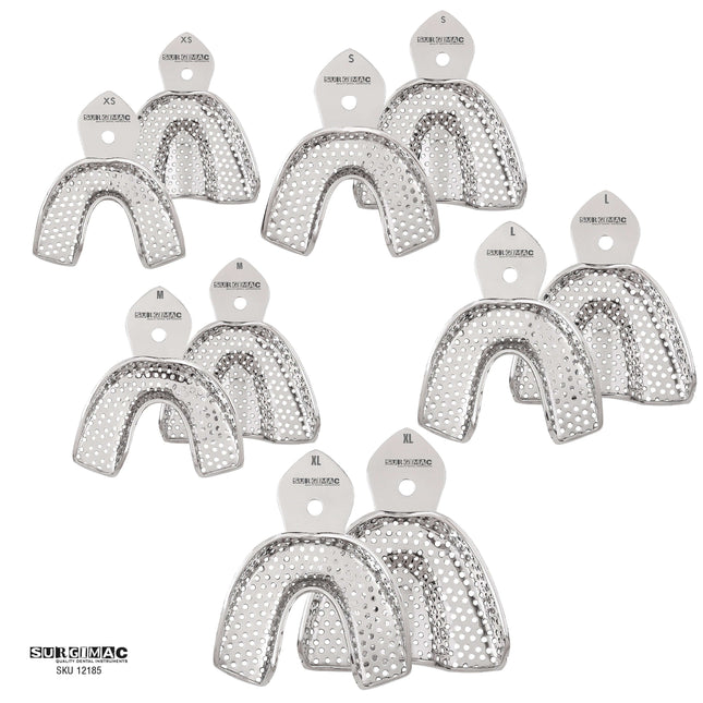 Impression Trays - Regular Perforated Full-Arch Stainless Steel (Set of 10):This set includes 10 high-quality, autoclavable stainless steel impression trays designed for full-arch impressions. The perforated design improves retention of impression material, ensuring accurate results with minimal distortion. Each tray is corrosion-resistant, reusable, and features ergonomic handles for easy placement and removal. Assorted regular sizes are included to suit various patient needs. Ideal for general dentistry, orthodontics, prosthodontics, and lab use.
