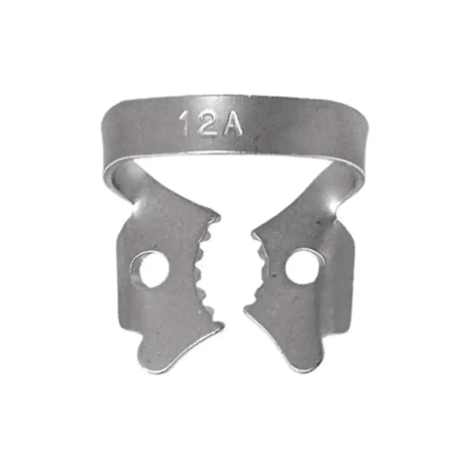 A dental dam is anchored around the crown of a tooth to seal it off whilst receiving treatment. The clamps come in a variety of sizes. Style 1A.