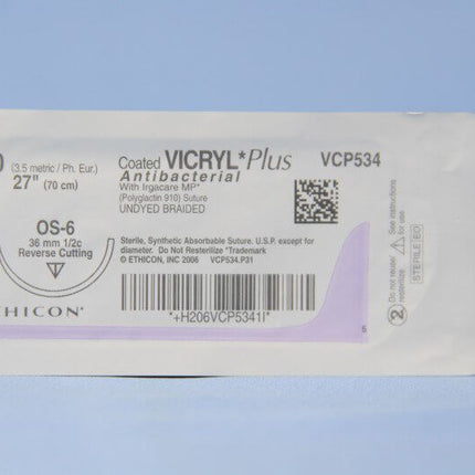 Coated Vicryl™ Plus Polyglactin 910 with Irgacare MP Antibacterial Suture OS-6 1/2 Circle Reverse Cutting Needle Size 0 Braided